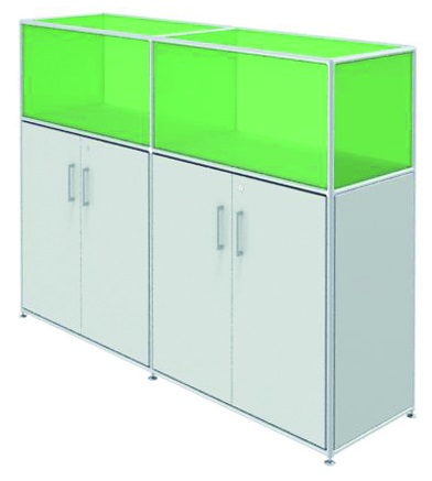 mit 2 Doppeltürelementen. innen je 1 Fachboden. oben offenes Element mit Glas folierten Paneelen. vom Arbeitsplatz aus nutzbar. Glas foliert/nach Oracal Farbkarte/Preisgruppe PB 158,4 | T 43,2 | H 119,2 cm