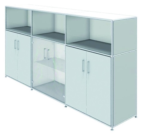 unten mit Türen und je 1 verstellbaren Fachboden. Mittig Türenpaar und Fachboden Klarglas/Preisgruppe F. Front lackiert nach RAL/Preisgruppe EB 236,6 | T 43,2 | H 119,2 cm