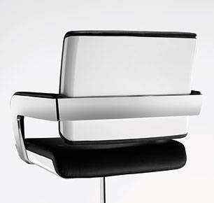 niedriger Rücken mit weißer Kunststoffverkleidung, ergänzt durch den Armlehnenträger in Edelstahloptik gebürstet.